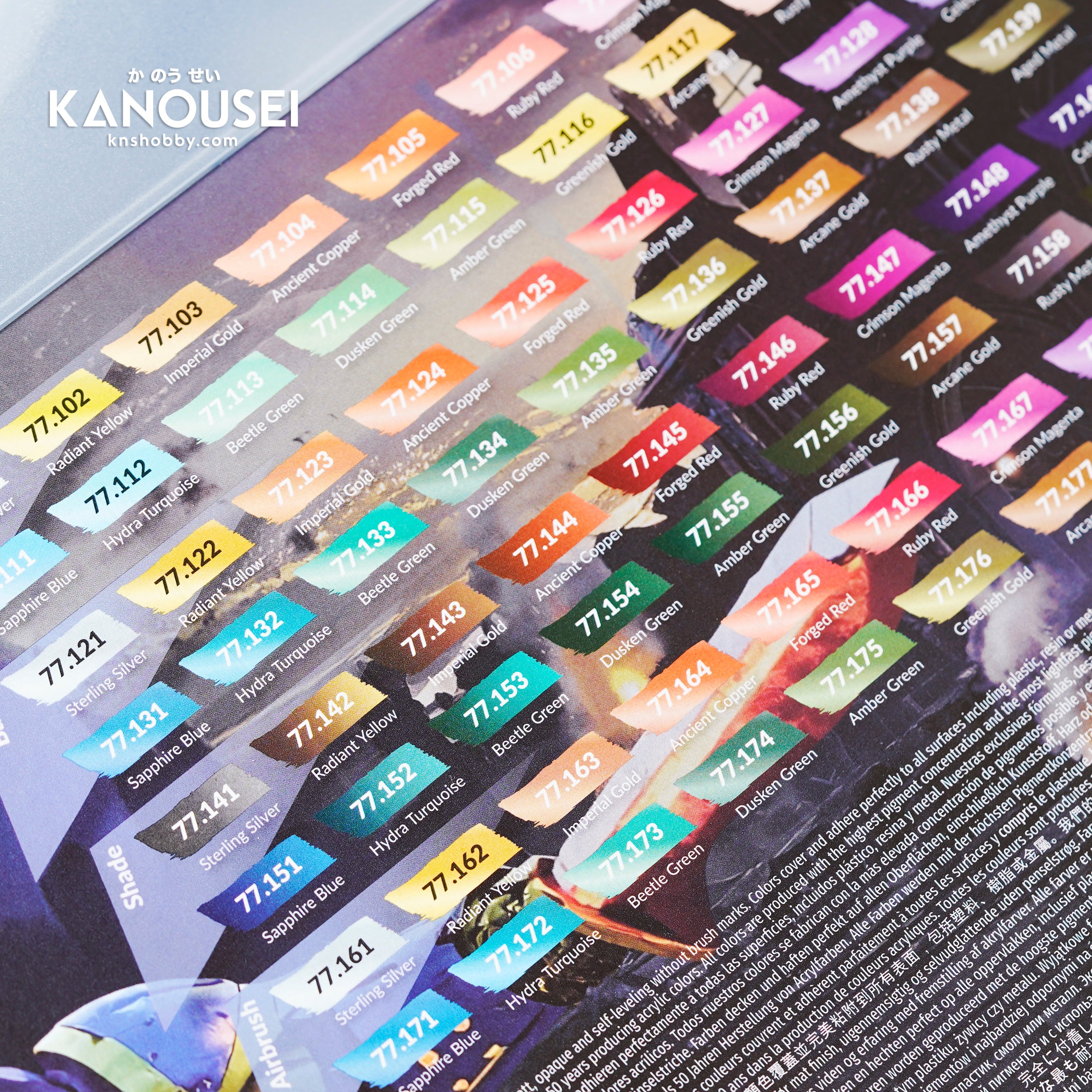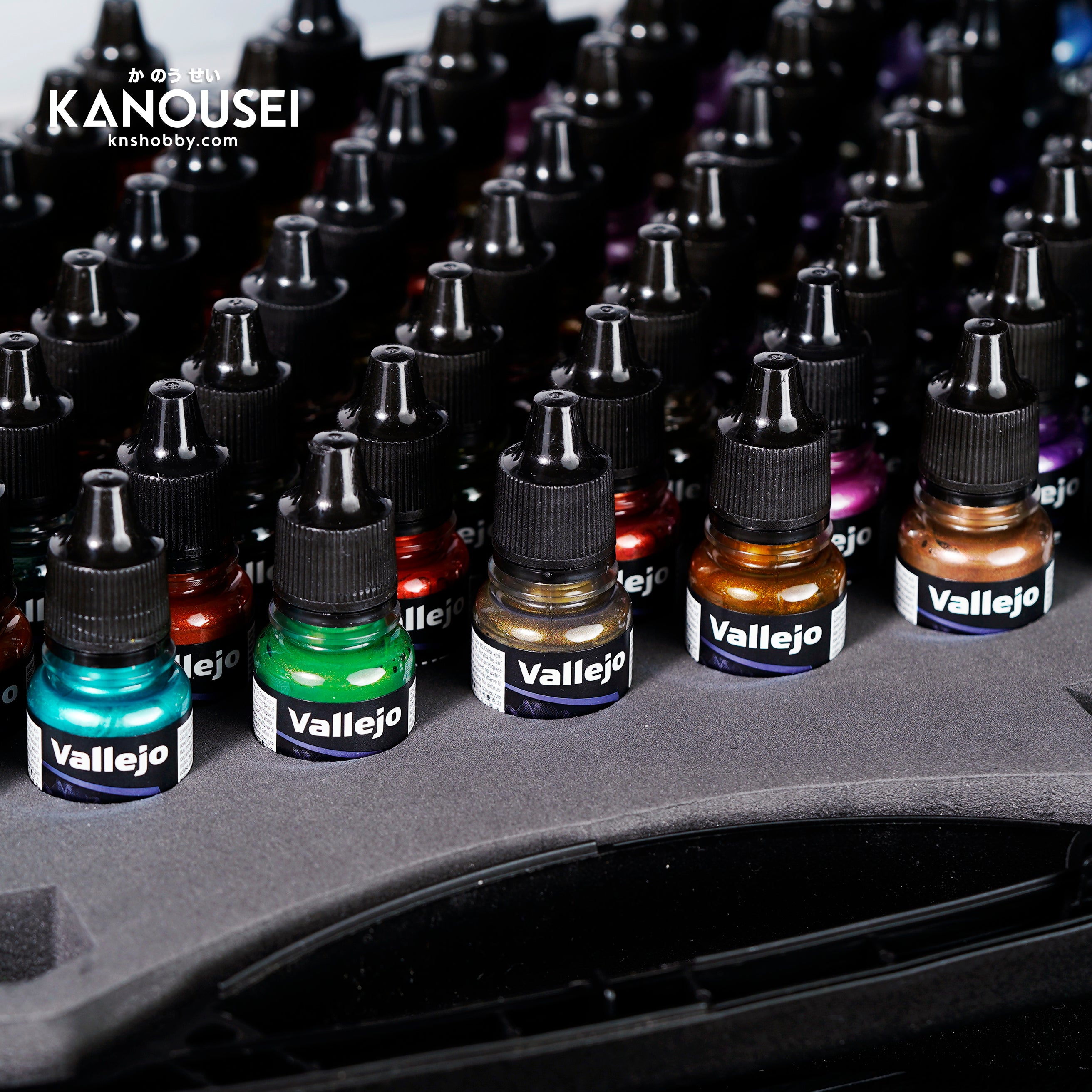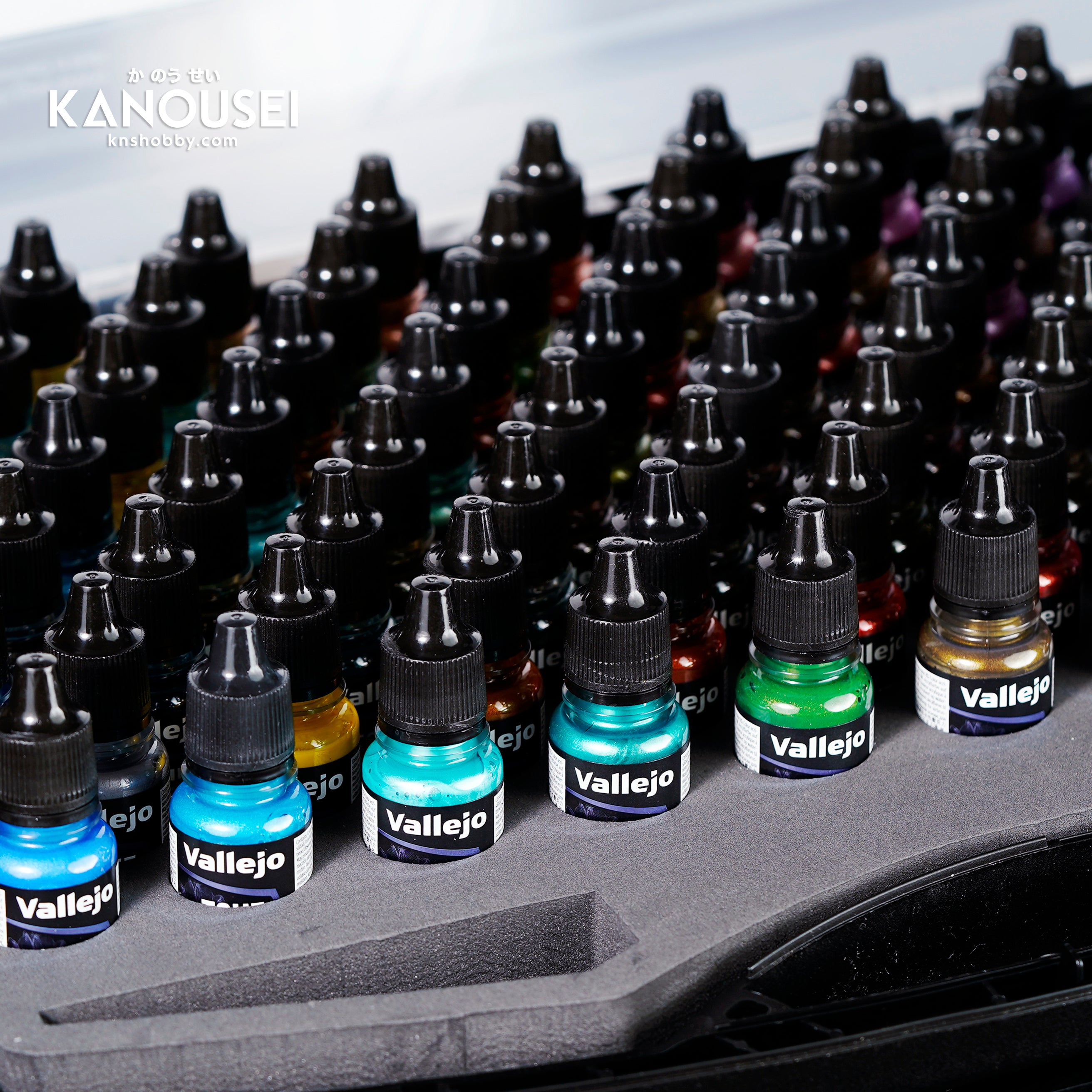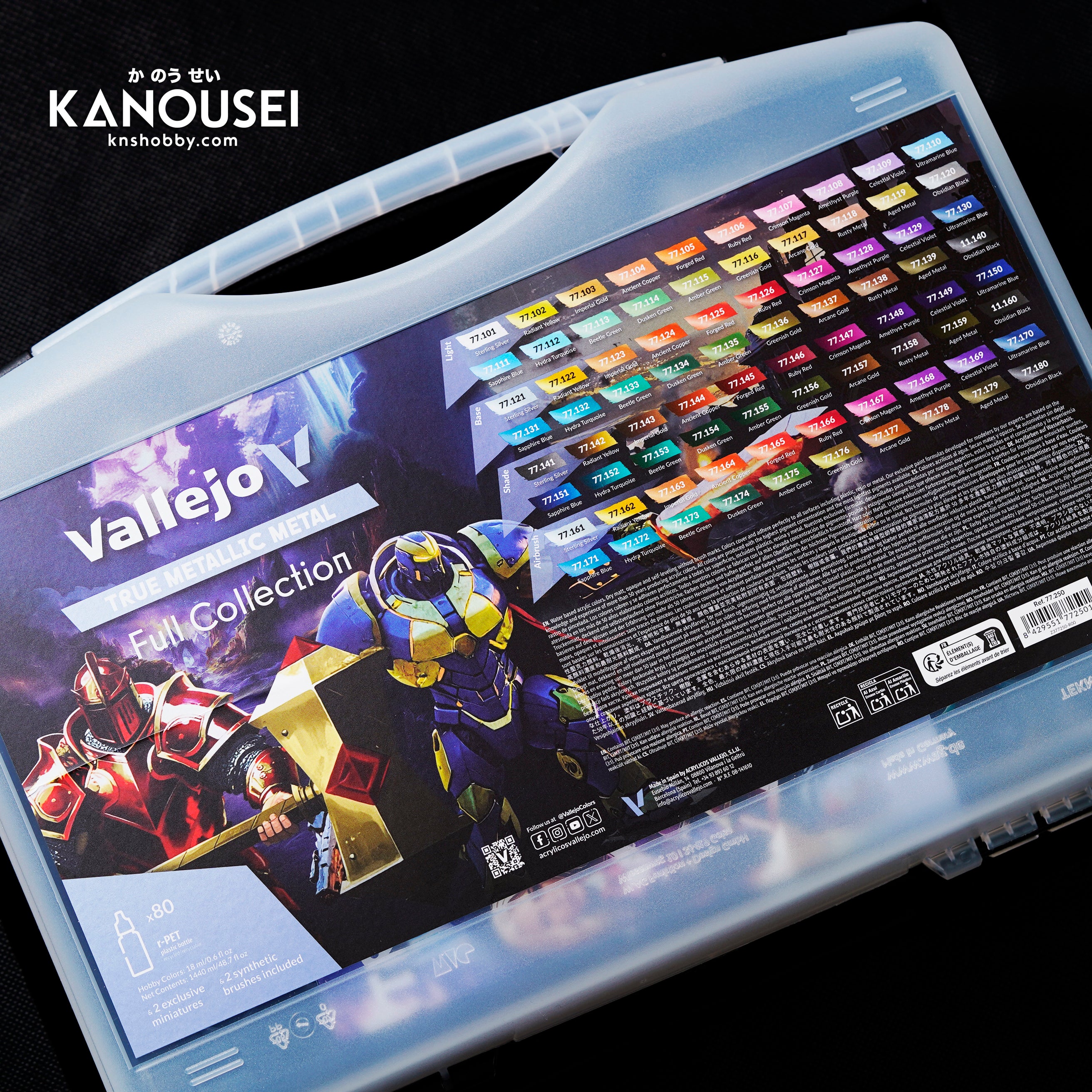 It includes 20 Light colors, 20 metallic Base tones, 20 non-metallic satin Shades, and 20 Airbrush Base colors. The case also comes with one round brush, one Dry Brush and two exclusive miniatures, specially designed for this collection.